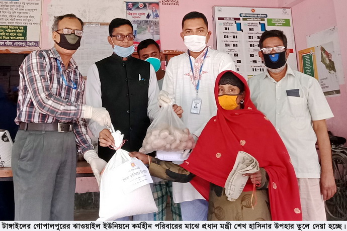 দুর্যোগ ব্যবস্থাপনা ও ত্রাণ মন্ত্রণালয় এবং উপজেলা প্রশাসন গোপালপুরের ব্যবস্থাপনায় প্রাণঘাতি করোনা ভাইরাস প্রাদুর্ভাবের ফলে কর্মহীন হয়ে পড়া ২’শত ৫৯ পরিবারকে (মাননীয় প্রধান মন্ত্রী শেখ হাসিনার উপহার) ১০কেজি চাল ও ৩কেজি করে গোলআলু ২১ এপ্রিল মঙ্গলবার সামাজিক দুরত্ব বজায় রেখে প্রদান করা হয়।