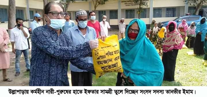 শনিবার (২ মে) উল্লাপাড়ার সংসদ সদস্য তানভীর ইমাম তাঁর ব্যক্তিগত তহবিল থেকে উপজেলার মোট ২’হাজার পরিবারের মধ্যে এসব ইফতার সামগ্রী বিতরণ করেন। এসময় উপস্থিত ছিলেন, উপজেলা আওয়ামী লীগের আহ্বায়ক মুক্তিযোদ্ধা গোলাম মোস্তফা, উপজেলা পরিষদের ভাইস চেয়ারম্যান মনিরুজ্জামান পান্না ও রিবলী ইসলাম কবিতা, সলপ ইউপি চেয়ারম্যান ও সলপ ইউনিয়ন আওয়ামী লীগের সভাপতি প্রকৌশলী শওকাত ওসমান, সলপ ইউনিয়ন আওয়ামী লীগের সাধারণ সম্পাদক এহসানুল হক সন্টু, উপজেলা যুবলীগের আহ্বায়ক মীর আরিফুল ইসলাম উজ্জল প্রমুখ।