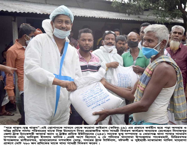 এরই অংশ হিসেবে ২ মে শনিবার খানসামা উপজেলার পাকেরহাট, চিরিরবন্দর উপজেলার রাণীরবন্দর, কাহারোলের দশমাইল মোড়, সদরের ট্রাক টার্মিনাল, বটতলী ও সুইহারী-মাঝাডাঙ্গা দাখিল মাদ্রাসা প্রাঙ্গণে মোট ৭৬০ জন শ্রমিকের মাঝে খাদ্য সামগ্রী বিতরণ করেন।