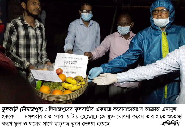অমর চাঁদ গুপ্ত, ফুলবাড়ী (দিনাজপুর) থেকে : করোনাভাইরাস যুদ্ধে জয়ী হয়ে স্বাভাবিক জীবনে ফিরে পেলেন দিনাজপুরের ফুলবাড়ীর একমাত্র করোনাভাইরাসে (COVID-19) আক্রান্ত এনামুল হক। এনামুল হক ফুলবাড়ী উপজেলার ৬নং দৌলতপুর ইউনিয়নের দৌলতপুর মধ্যমপাড়া গ্রামের তোফাজ্জল হোসেনের ছেলে।
