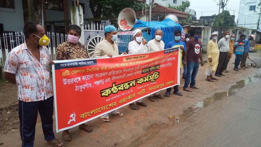 বৃস্পতিবার বেলা সাড়ে ১২টায় করোনার নমুনা পরিক্ষা কেন্দ্র স্থাপনের দাবীতে দিনাজপুর প্রেসক্লাবের সন্মুখ সড়কে ঘন্টাব্যাপী মানববন্ধন কর্মসুচী পালন করেছে বাংলাদেশের ওয়ার্কাস পাটির নেতাকর্মী ও সমর্থকেরা।