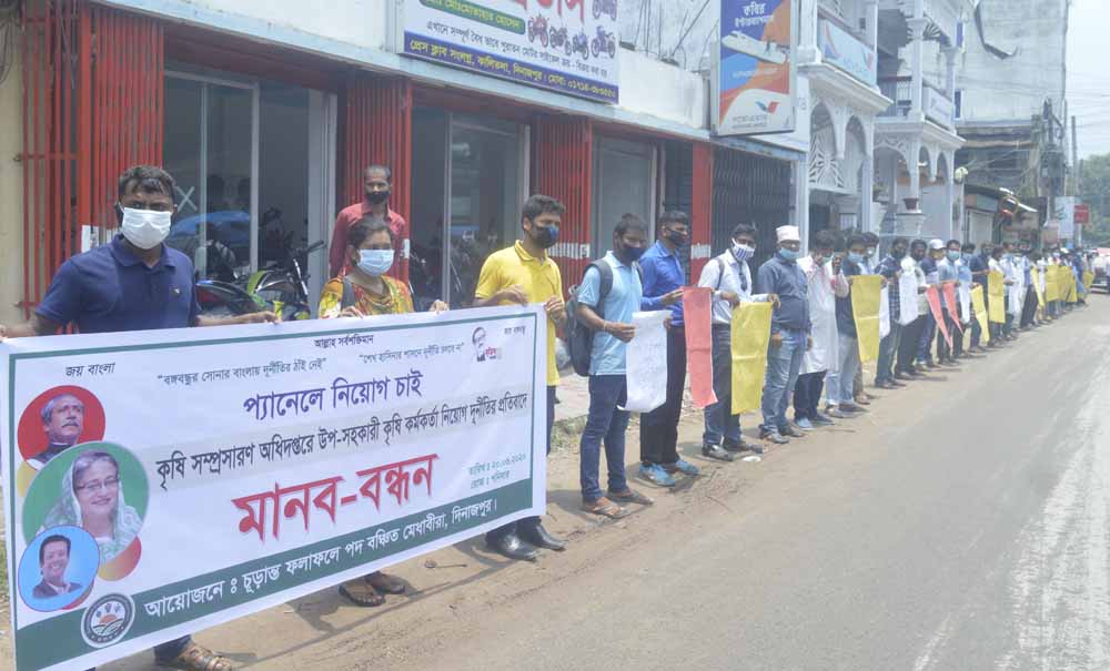 রফিকুল ইসলাম ফুলাল, দিনাজপুর থেকে : উপ-সহকারী কৃষি কর্তকর্তা পদে জনবল নিয়োগে মেধাবীদের বঞ্চিত, জেলা ভিত্তিক কোটা অনুসরন না করা,অনিয়ম-দূর্নীতির মাধ্যমে ত্রুুটিপূর্ণ ফলাফল প্রকাশের প্রতিবাদ এবং বঞ্চিতদের পুন:নিয়োগের দাবীতে শনিবার সকাল ১১টায় দিনাজপুর প্রেসক্লাবের সন্মুখ সড়কে সামাজিক দুরুত্ব বজায় রেখে ঘন্টাব্যাপী মানববন্ধন করেছে দিনাজপুরের চুড়ান্ত ফলাফলে পদ বঞ্চিত মেধাবীরা।